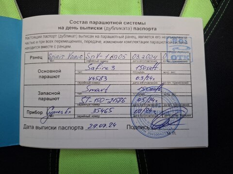 Запасной парашют Smart 150. Дата изготовления 05.2024. Отдельно - 160000р.